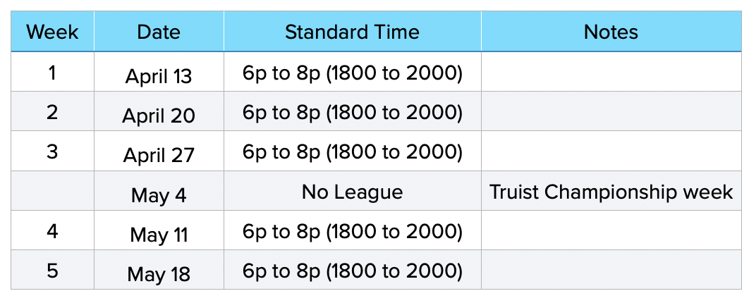 Approach Challenge League Format: Primary team competition counting toward league standings. Two person teams play a selected nine shot approach format from multiple fixed yardages. Scoring is cumulative based on distance from the pin; for example, if your ball finishes 25 yards away, you earn 25 points. Penalties for missing the pin add points to your total, and a lower overall score is better. Teams will play two rounds on the same nine hole course, and all players must complete the rounds. The Team score is calculated by adding the total scores of both players together, and the lowest combined score wins the weekly matchup.